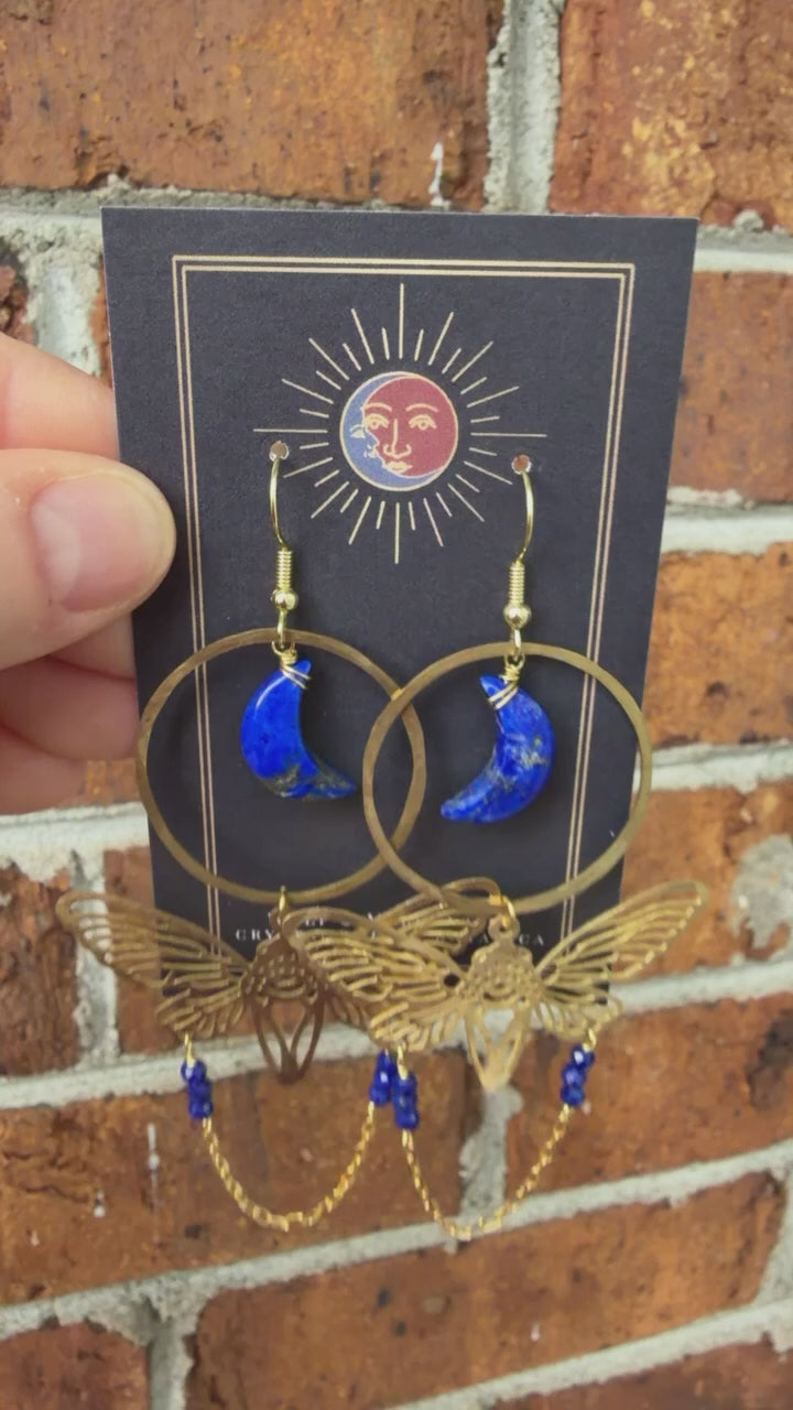 Lapis Lazuli Brass Moon/Moth Earrings
