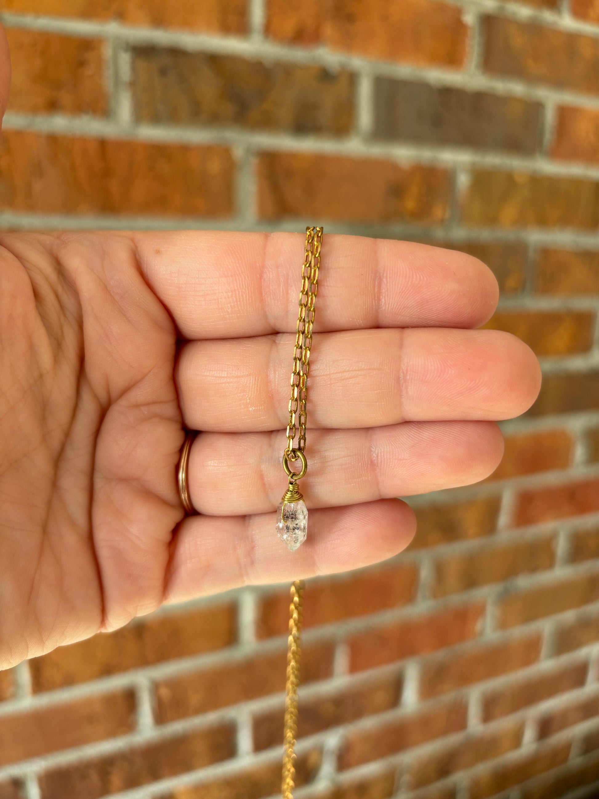 Pakimer Diamond (Quartz) pendant on a brass chain measuring at 30 inches.